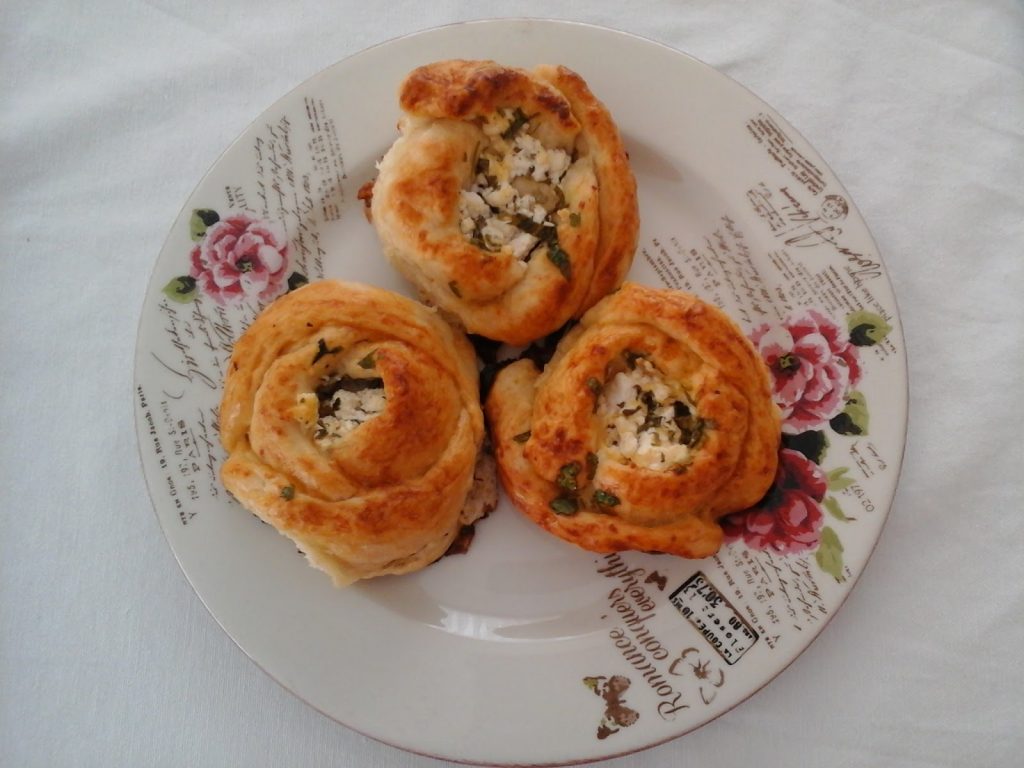 Bu arada hamurumuz mayalandı. Hamuru ceviz büyüklüğünde bezelere ayırıyoruz. Bir adet bezeyi avucumuzda açıp ortası bölünmeyecek şekilde dört yerinden kesiyoruz. Yani bir nevi artı şekli gibi…Sonra ortasına malzemeden koyup kestiğimiz 4 dilimi sırasıyla çiçek şeklini vererek kapatıyoruz. Bütün bezeleri bu şekilde doldurduktan sonra üstlerine yumurta sarısı sürüp biraz da toz şeker serpiyoruz. 200 derecelik önceden ısıttığımız fırına koyarak pişmeye bırakıyoruz.